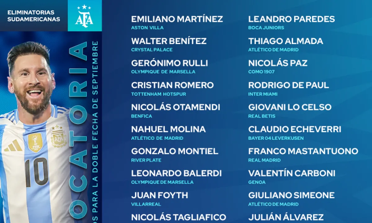 La Asociación del Fútbol Argentino (AFA) confirmó la lista definitiva de convocados de la Selección Argentina para la última doble fecha de Eliminatorias Sudamericanas, donde laprincipal novedad, además de la presencia de Lionel Messi, es la inclusión de varios jugadores jóvenes.