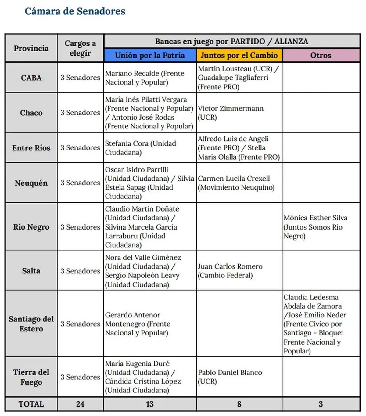 Las 24 bancas de senadores en disputa corresponden a Río Negro, Salta, Neuquén, Tierra del Fuego, Santiago del Estero, Entre Ríos, Chaco y la Ciudad Autónoma de Buenos Aires. En cada jurisdicción se designarán tres senadores bajo el sistema de mayoría y minoría.