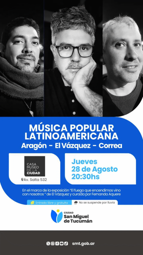 El jueves 28 de agosto, a las 20.30 h, en la Casa Museo de la Ciudad, ubicado en avenida Salta 532, se llevará a cabo un recital de Música Popular Latinoamericana, en el marco de la exposición “El fuego que encendimos vino con nosotros”, del artista Javier El Vázquez, curada por Fernanda Aquere.
