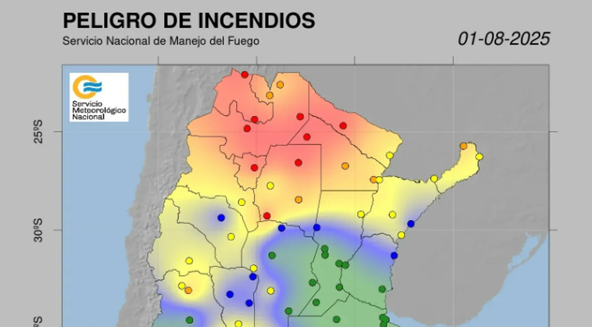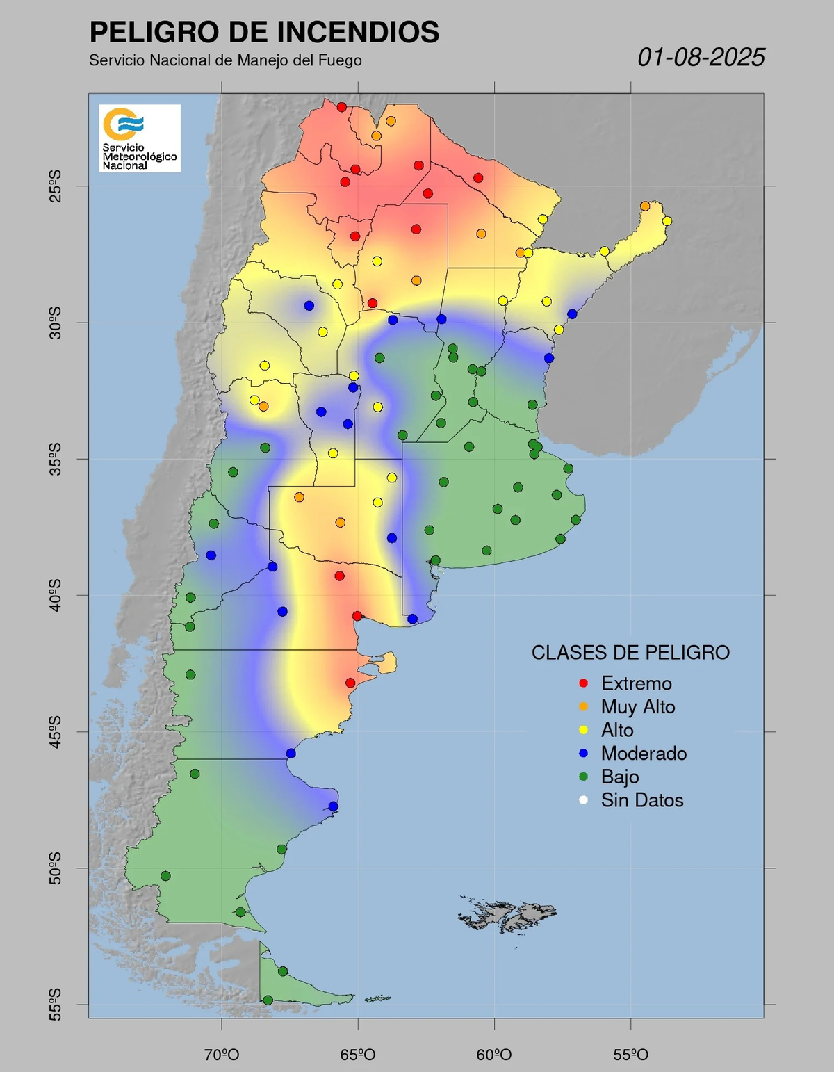 De acuerdo con el informe del Servicio Nacional de Manejo del Fuego, el mapa actualizado muestra a gran parte del noroeste argentino —incluyendo a Tucumán— bajo la categoría de “peligro extremo” (color rojo), una de las más críticas del sistema de clasificación.