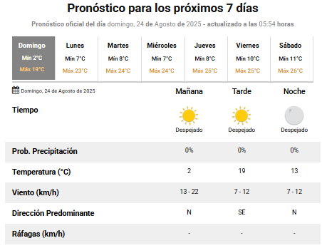 El Servicio Meteorológico Nacional (SMN) anticipó para este domingo 24 de agosto, que Tucumán tendrá una jornada soleada con una máxima que llegará a los 19°C.