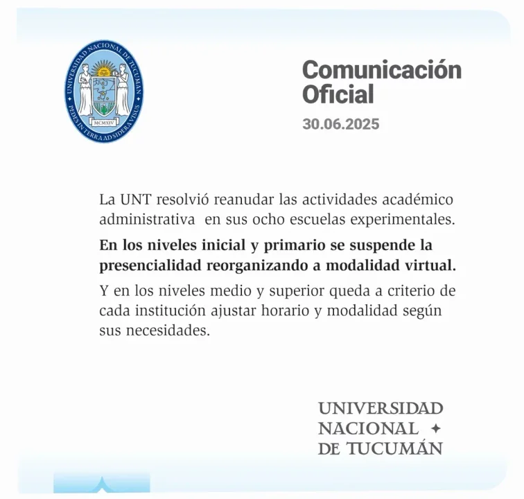 Conforme a la Res. N° 9363/2025 de la Dirección de Escuelas Experimentales de la Universidad Nacional de Tucumán (UNT), se resolvió reanudar a partir del martes 1 de julio.