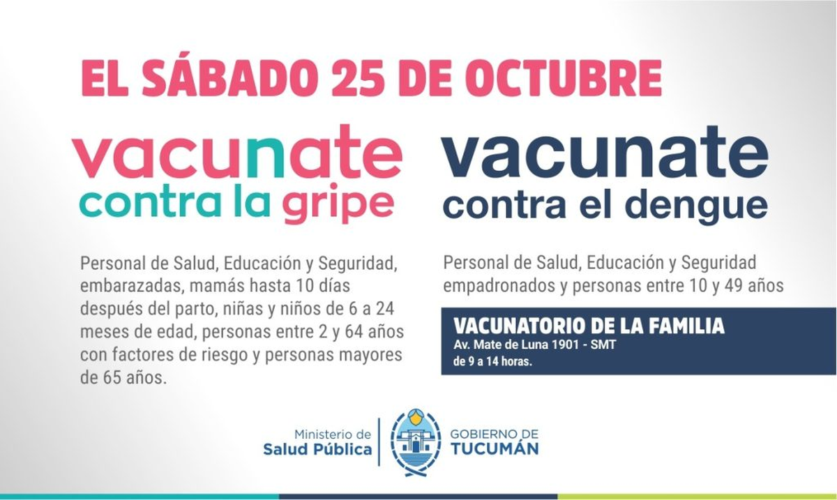 El Ministerio de Salud Pública de Tucumán, a cargo del doctor Luis Medina Ruiz, llevará adelante una nueva jornada de vacunación gratuita este sábado 25 de octubre, destinada a prevenir dos enfermedades estacionales: la gripe y el dengue. La actividad se desarrollará de 9 a 14 horas en el Vacunatorio de la Familia, ubicado en Avenida Mate de Luna 1901, San Miguel de Tucumán.