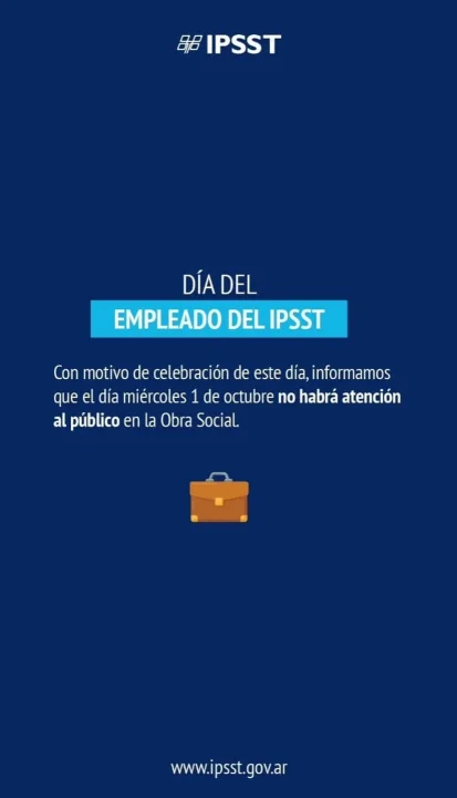 Este miércoles 1 de octubre se conmemora el Día del Empleado del Instituto de Previsión y Seguridad Social de Tucumán, y por este motivo, no habrá atención al público. Todas las filiales de la obra social estatal permanecerán cerradas.