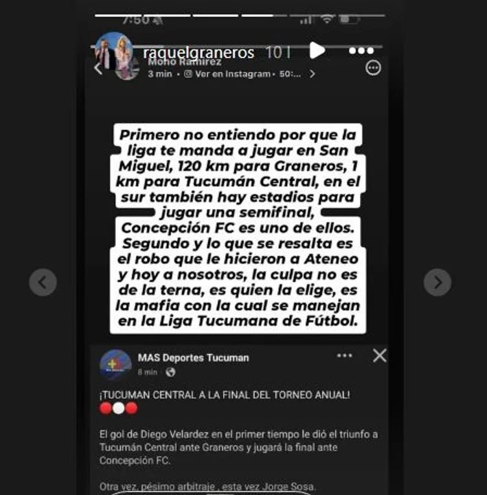 Mientras se disputaba el partido, Raquel Graneros, intendenta de la ciudad que lleva su mismo apellido, publicó un fuerte y crítico posteo en contra de la Liga Tucumana.
