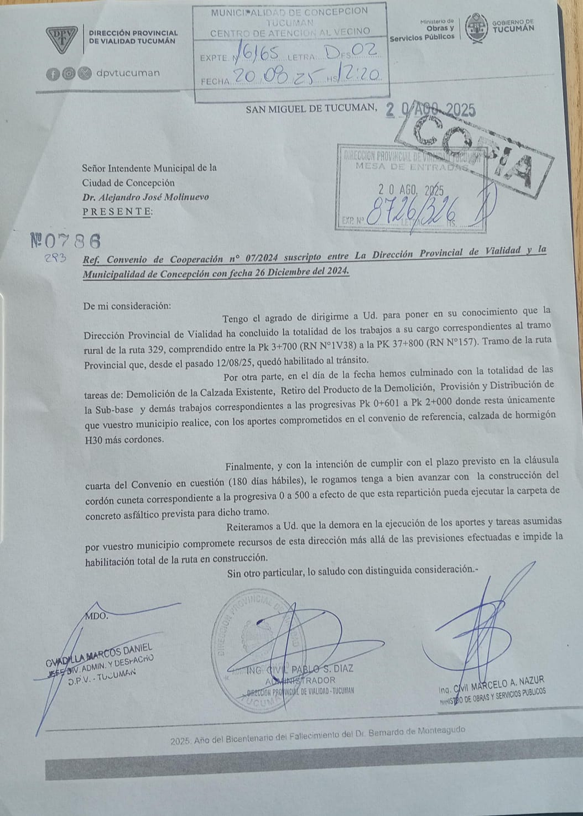 El escrito está dirigido al intendente Alejandro Molinuevo y lleva las firmas del ministro de Obras y Servicios Públicos, Marcelo Nazur, y del titular de la DPV, Pablo Díaz.