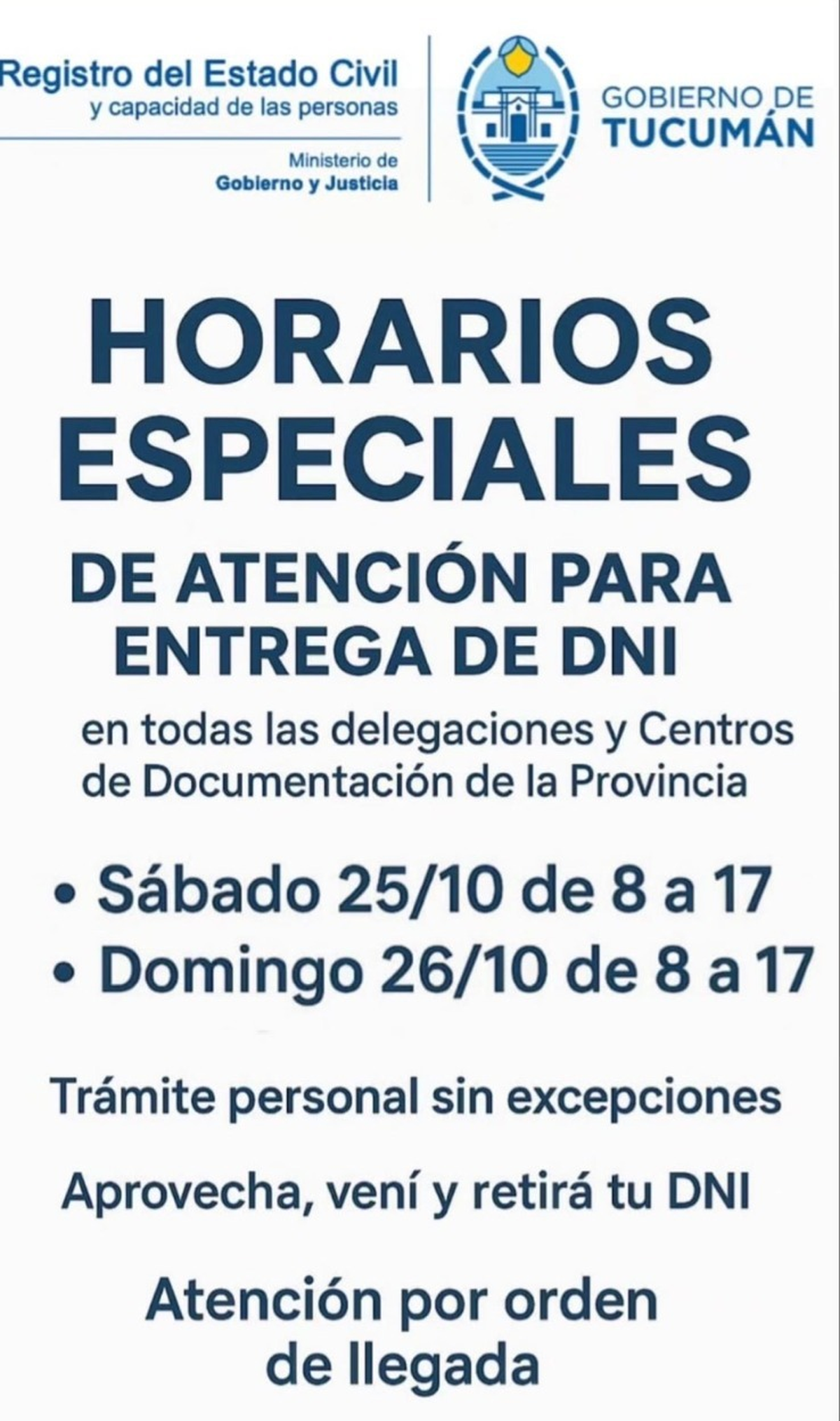 En el marco de las elecciones legislativas 2025, el Registro Civil y Capacidad de las Personas de la provincia dispuso un operativo especial de entrega de Documentos Nacionales de Identidad (DNI) para el fin de semana.