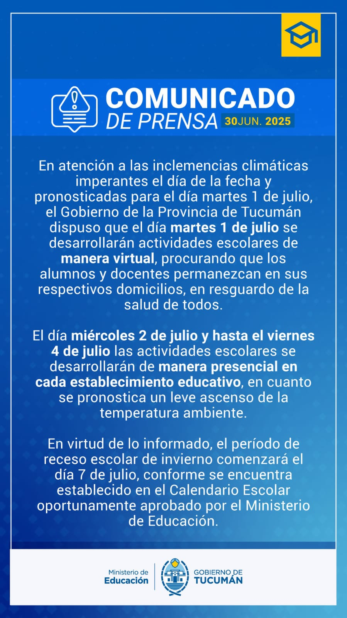 “Mañana va a ser igual o más frío que hoy, así que este martes, también lo hablamos con el ministro de Salud Pública (Luis Medina Ruiz) para ver el tema de salud de los chicos, porque no queremos chicos internados por problemas respiratorios; así que por todos esos motivos mañana, al igual que hoy, se van a suspender las clases presenciales y se retoma el día miércoles”, anunció la Ministra.