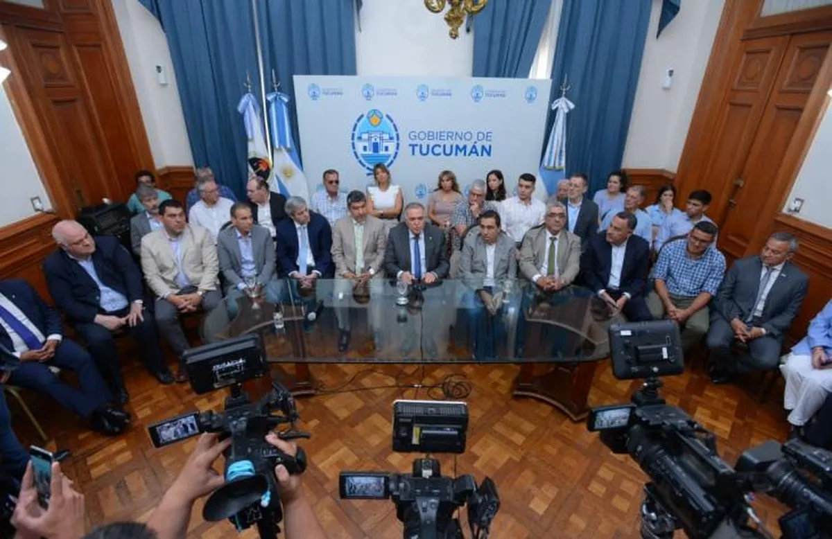Durante la conferencia de prensa el Gobernador estuvo acompañado del vicegobernador, Miguel Acevedo; el presidente subrogante de la Legislatura, Sergio Mansilla; el diputado nacional Agustín Fernández; los ministros Daniel Abad (Economía y Producción), Marcelo Nazur (Obras Públicas), Regino Amado (Gobierno y Justicia), Federico Masso (Desarrollo Social), Darío Monteros (Interior); la fiscal de Estado, Gilda Pedicone de Valls; el secretario general de la Gobernación, Federico Nazur; y secretarios y subsecretarios de Estado.