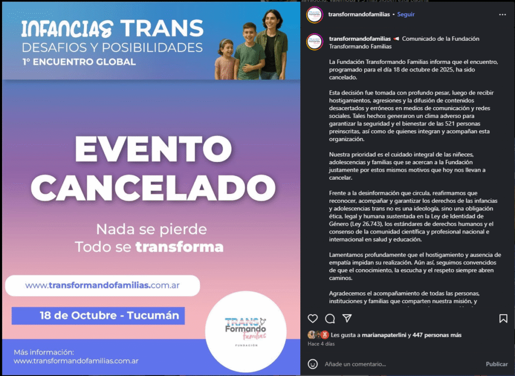 Según el comunicado oficial de la Fundación “Transformando Familias”, encargada de su realización, lamentaron la suspensión y que “fue una decisión tomada con profundo pesar, luego de recibir hostigamientos y agresiones y la difusión de contenidos desacertados y erróneos en medios de comunicación y redes sociales”.