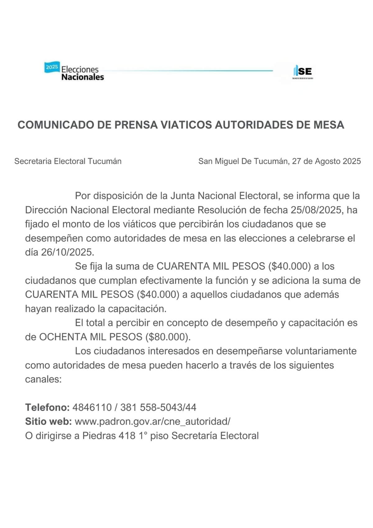 Comunicado de la Secretaría Electoral de Tucumán
