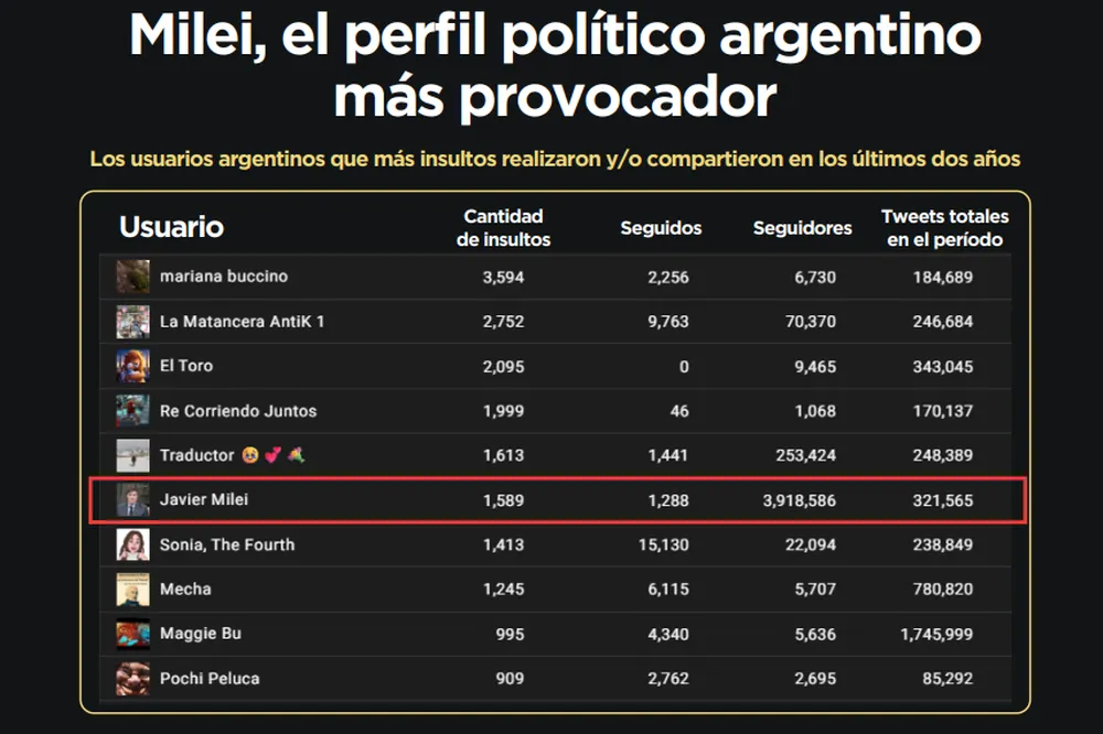 Uno de los mayores responsables de esta dinámica fue el presidente Javier Milei, quien publicó y compartió 1.589 insultos en el último bienio, convirtiéndose en el usuario no troll más agresivo en términos de agresiones verbales. Sin embargo, no solo los libertarios participan de esta guerra de insultos. Los sectores políticos más importantes del país, incluidos los vinculados al PRO (1274) y al peronismo (480), también alimentaron este fenómeno, con figuras destacadas utilizando las redes para atacar a sus opositores.