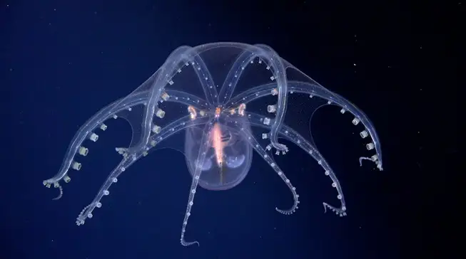 Un ctenóforo, probablemente Bathocyroe fosteri. Estos animales gelatinosos emplean hileras de cilios para desplazarse y capturar presas con células adhesivas. Bathocyroe fosteri presenta un cuerpo transparente en forma de campana con lóbulos y un tono iridiscente, y puede alcanzar hasta 6 centímetros. Se encuentra en aguas profundas y es capaz de producir bioluminiscencia, destacándose por el brillo en arcoíris de sus cilios bajo la luz de los vehículos operados remotamente.