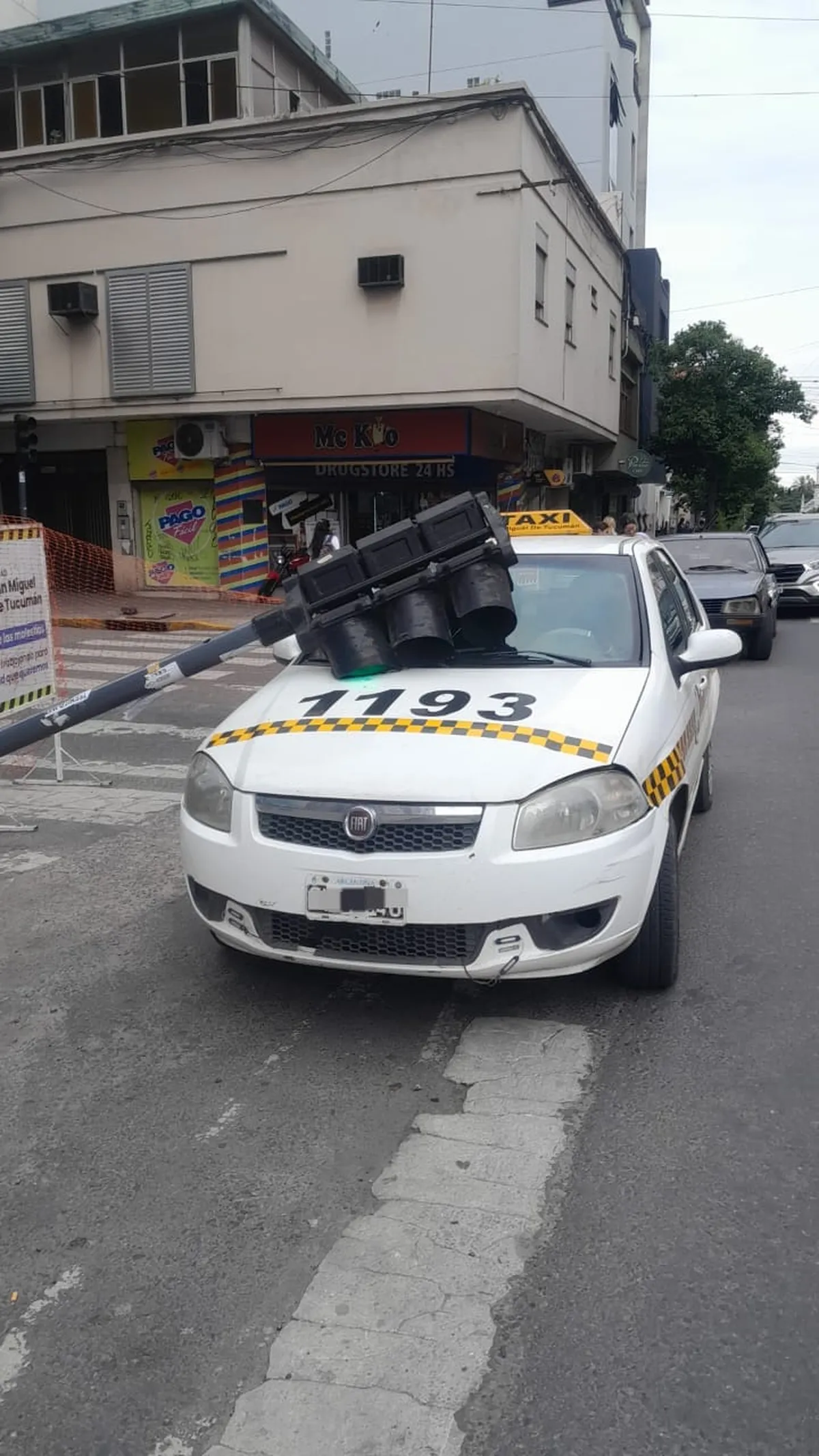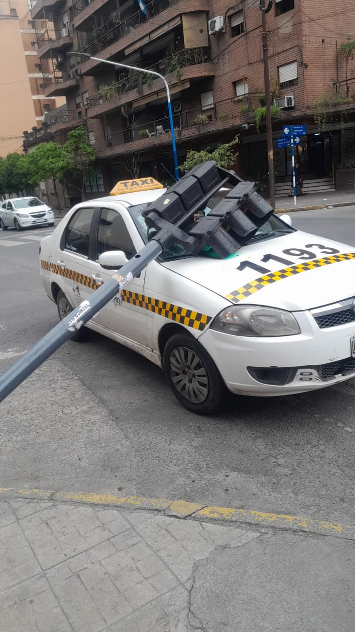 Un poste que sostiene un semáforo cayó sobre un taxi. Ocurrió en la esquina de Monteagudo y Santiago Del Estero y el chofer llevaba una pasajera.