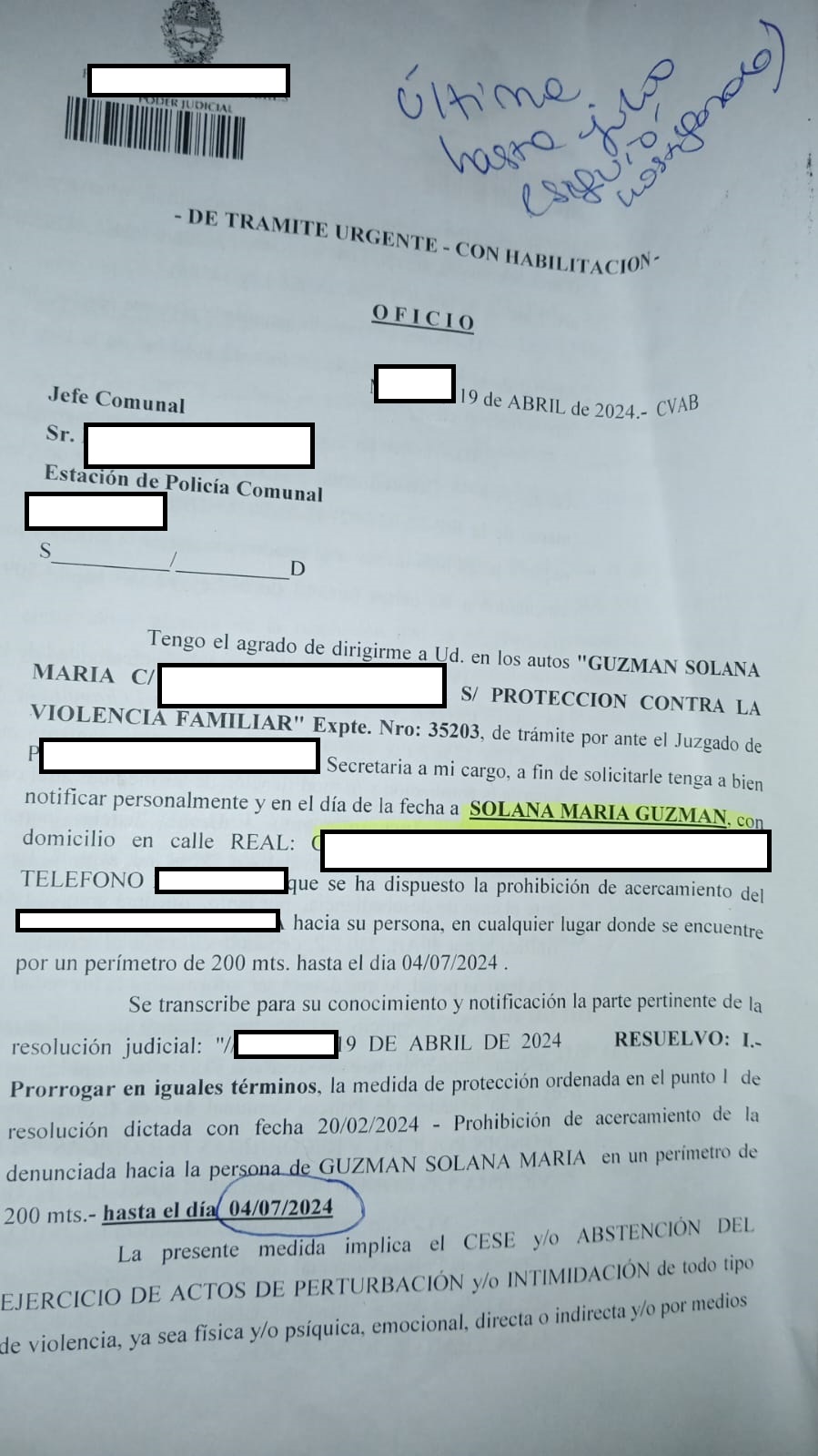 La denunciante cuenta con un total de 4 perimetrales dictadas para su madre, siento esta la última de ellas: /eltucumano
