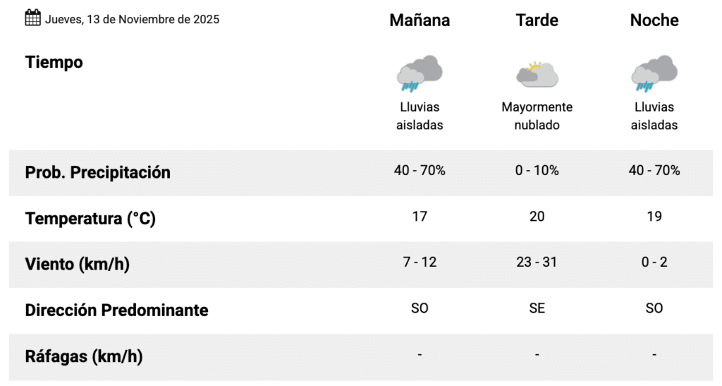 El Servicio Meteorológico Nacional anuncia para este jueves una jornada con lluvias aisladas por la mañana, mayormente nublado por la tarde y lluvias aisladas nuevamente por la noche. Se espera una temperatura con mínimas de 15º y una máxima de 20º.